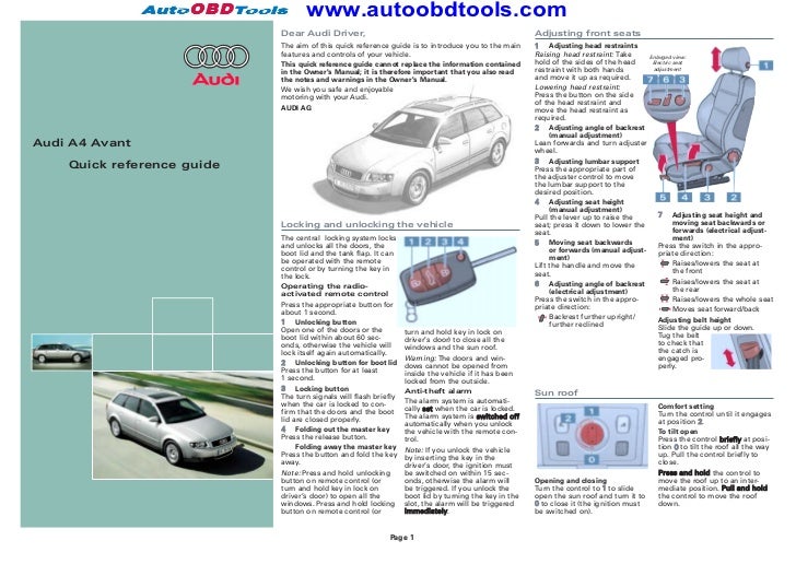 Audi A4/A4 Avant Quick reference guide 1 4 2 3 1 WARNING! Locking and unlocking the vehicle Filling the tank The doors and windows cannot be opened from inside the vehicle if it has been locked from the outside. Dear Audi Driver, This quick reference guide gives you a brief introduction to the main features and controls of your vehicle. Audi Service Manuals PDF, Workshop Manuals, spare parts catalog, fault codes and wiring diagrams. Training manual template download. The new AUDI Repair Manuals presented here should provide real assistance to the driver in any difficult situation on the road or in the garage, which concerns the operation, maintenance, diagnostics and repair of these machines. Immediately attracts the attention of an impressive number of manuals. View and Download AUDI A4 owner's manual online. A4 Automobile pdf manual download. Automobile Accessories Audi A4 User Manual (5 pages) Automobile Audi A4 Quick Reference Manual. Automobile (4 pages). Page 1 2007 9:16 09 Audi A4 Owner's Manual.